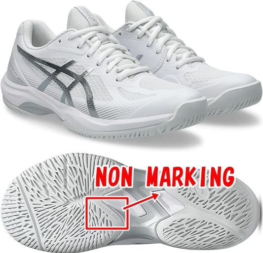 ノンマーキングソールを採用し、グリップ力と耐久性を両立。アシックス特有のクッション技術により、快適な履き心地を実現しています。